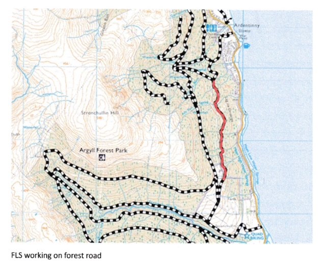 From Civils: There are ongoing road upgrade works at Ardentinny affecting the forest track highlighted in red on the map attached. As part of this, tractors with trailers will be passing through the village to/from Gairletter quarry arriving/leaving Laird’s Grave entrance. The purpose of these works is to prepare the road for harvesting access to clear the windblow caused by storm Eowyn in January.